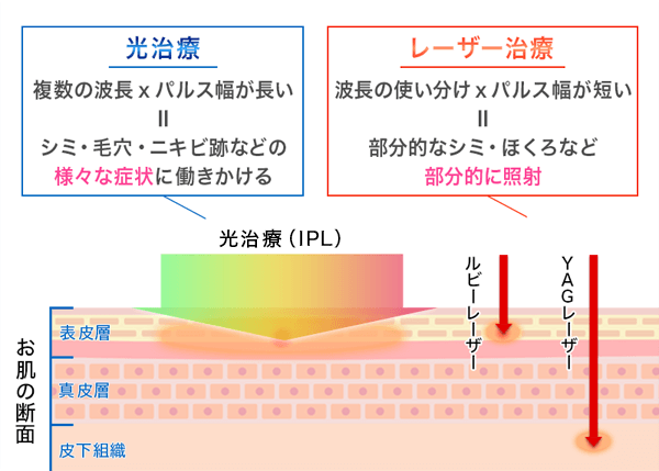 一方フォトフェイシャルなどの光治療は、複数の波長の集合体で、照射時間が長いのが特徴です。