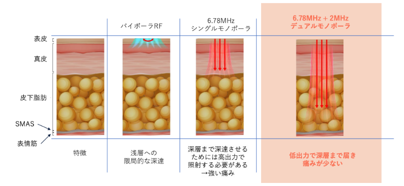 - 「Deep」(6.78MHz+2MHz):真皮層~深層脂肪層