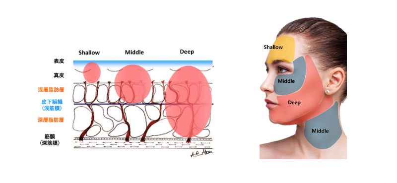 - 「Middle」(6.78MHz):真皮層~浅層脂肪層