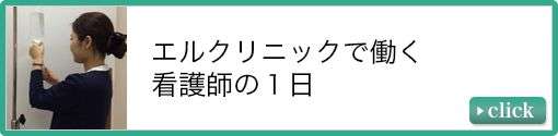 エルクリニック紹介 エルクリニックで働く看護師のある一日の流れ 10:30 出勤。白衣に着替え、掃除などの準備。 11:00 薬剤の在庫・申し送りなどの確認、開院前の準備。 12:00 開院。患者様をご案内。 12:00~18:59 施術・Drサポート業務 カウンセリング業務 予約の空きのある時間に施術の練習を行うことも。 19:00 終業。帰る前に皆でお茶しながら一息。 19:15 私服に着替えて、帰ります。 Facebook Twitter スタッフインタビュー シミの原因と見分け方